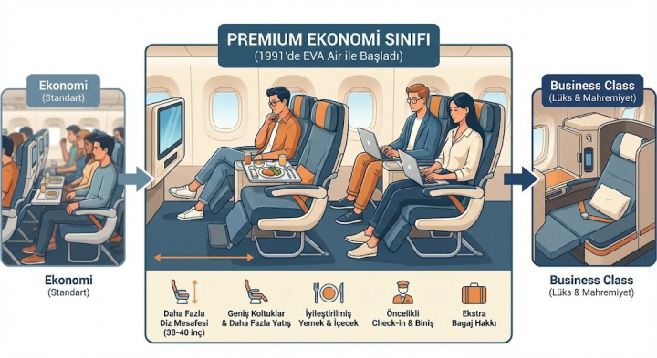 Ekonomi sınıfına göre daha fazla konfor, business sınıfına göre daha uygun fiyat sunan bir ara kabin sınıfı.