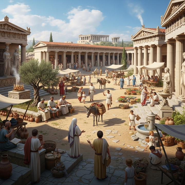 Antik Yunan kentlerinde ticaret, siyaset, din ve gündelik toplumsal etkileşimin iç içe geçtiği, yurttaşların bir araya gelerek kentin kamusal yaşamını kurduğu çok işlevli merkez mekânları ifade eden kavram.