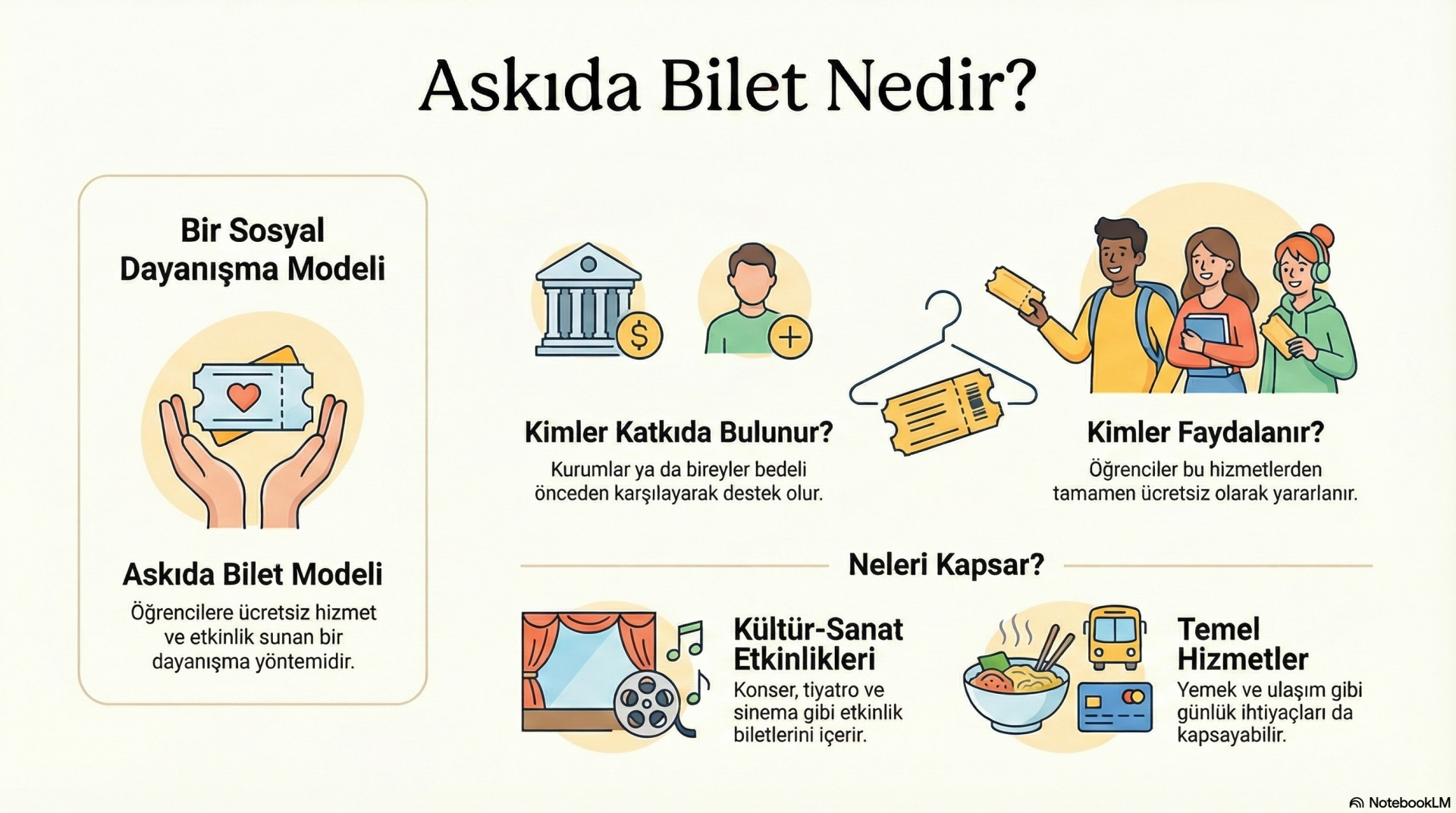 Bu ihtiyaçlar doğrultusunda, günümüz toplumsal bağlamında öğrencilerin kültürel kaynaklara erişimini destekleyecek yeni dayanışma modellerine gereksinim duyulmaktadır. Bu tarihsel ve toplumsal arka plan üzerine kurulan modelimiz, geleneksel askıda uygulamalarını daha sistematik ve sürdürülebilir bir yapıya dönüştürmeyi amaçlamaktadır. Bu durum, bağış süreçlerinin dijital bir platform üzerinden şeffaf bir şekilde yönetilmesi, öğrencilere ulaşmada somut kriterler geliştirilmesi ve kültür kurumlarıyla (tiyatro, yayınevleri vb.) sürekli işbirlikleri kurulması anlamına gelmektedir. Modelimiz; kurumların ve bireylerin öğrenciler için kültür-sanat etkinliklerine ait biletleri, yemek, ulaşım veya benzeri hizmetlerin bedellerini önceden karşılayarak, bu hizmetlerin öğrencilere ücretsiz ve adil bir biçimde ulaşmasını sağlayan bir sosyal dayanışma modeli sunmaktadır. Bu yönüyle model, askıda bilet pratiğinden yola çıkmakla birlikte, kapsamını genişleterek kültürel, sanatsal ve bilişsel gelişimi birlikte destekleyen bütüncül bir yapıya dönüşmektedir.