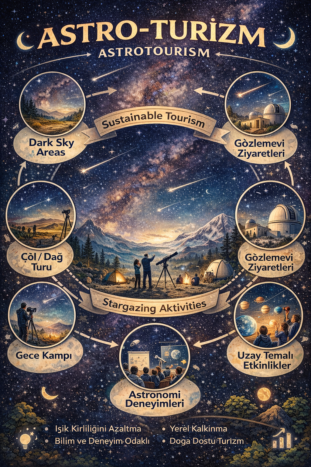Literatürde astro-turizm, doğal gece gökyüzünü turistik bir kaynak olarak kullanan ve astronomik, çevresel ve kültürel faaliyetlerle desteklenen bir turizm türü olarak tanımlanmaktadır. Bu turizm türü, özellikle kırsal kalkınma açısından önemli bir potansiyele sahiptir. Gece saatlerinde gerçekleştirilen etkinlikler, konaklama sürelerini uzatarak yerel ekonomilere katkı sağlamaktadır.