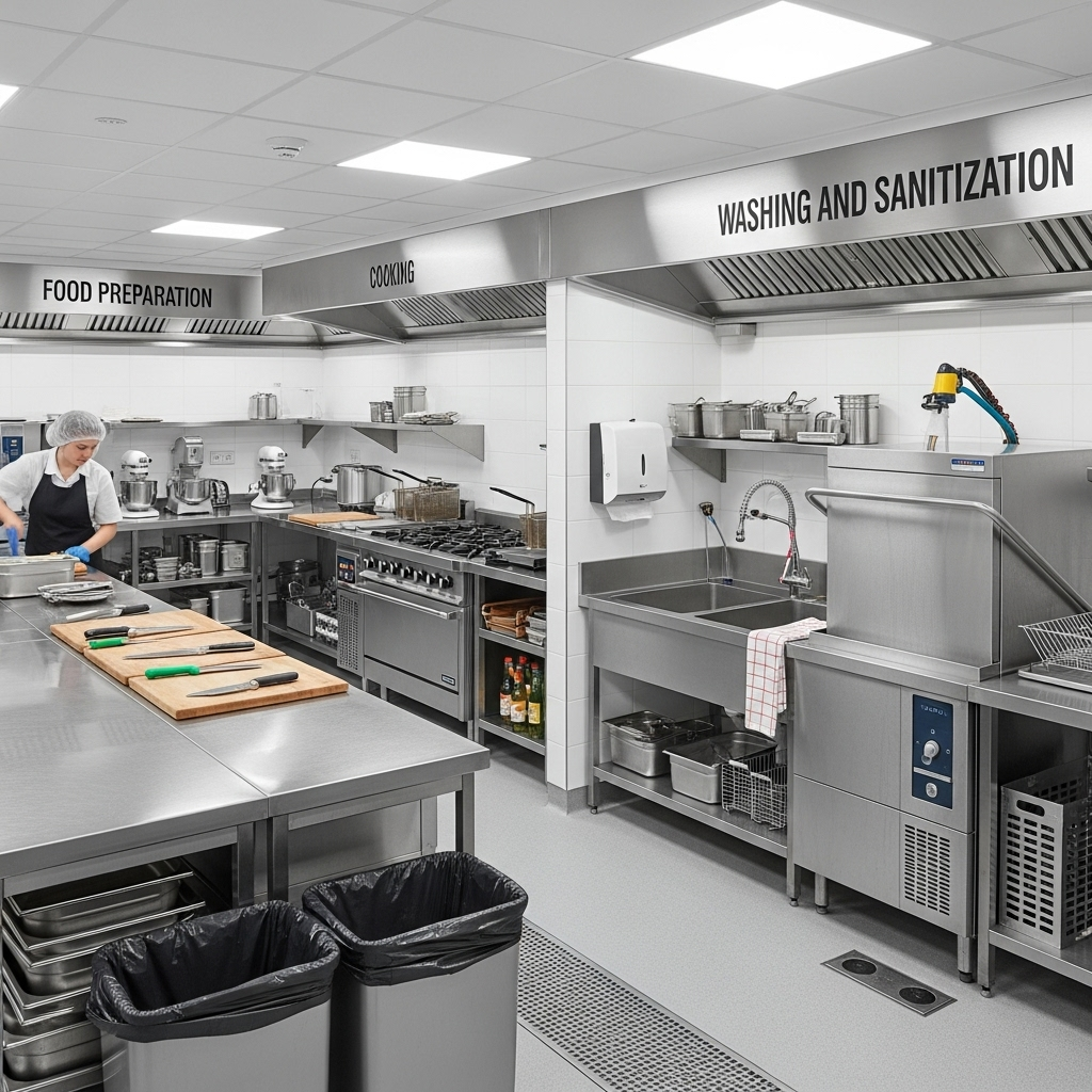 Bulaşık odasının iç yapısı genellikle kirli ve temiz bulaşıkları ayıran alanlar, sanayi tip bulaşık makineleri, lavabolar, raf düzenekleri ve atık yönetim sistemlerinden meydana gelmektedir. Ayrıca hijyen standartlarının korunması amacıyla çapraz bulaşma riskini önlemek için özel yöntemler kullanılmaktadır. Bu bölümde görev yapan personel, mutfak hijyen zincirinin temel bileşenlerinden biri olarak değerlendirilir.