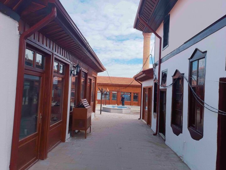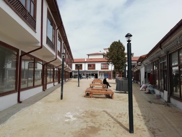 Çarşı: Cumhuriyet Meydanı’nın kuzeyine konumlandırılan çarşı birbirine bitişik 26 dükkandan oluşan yamuk bir üçgen şemaya sahiptir. 2023 yılında yapılan restorasyon çalışmasıyla özgün dokusuna geri döndürülmüştür. Dükkanların ana caddeye bakan yönleri tek katlı iken içe bakan yönler iki katlı olarak inşa edilmiştir. İç kısımda oturma alanları ve küçük bir sokak bulunmaktadır.