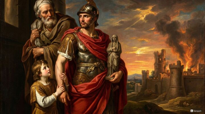 Pietas ve mos maiorum (ataların yolu): Aeneas’ın temel erdemi pietas (tanrılara, aileye ve topluma bağlılık) olarak vurgulanır. Babasını sırtında taşıması, aile–kuşak bağının simgesine dönüşür ve Augustus’un ahlâkî düzenlemeleriyle uyumlu bir ideolojik zemin üretir.